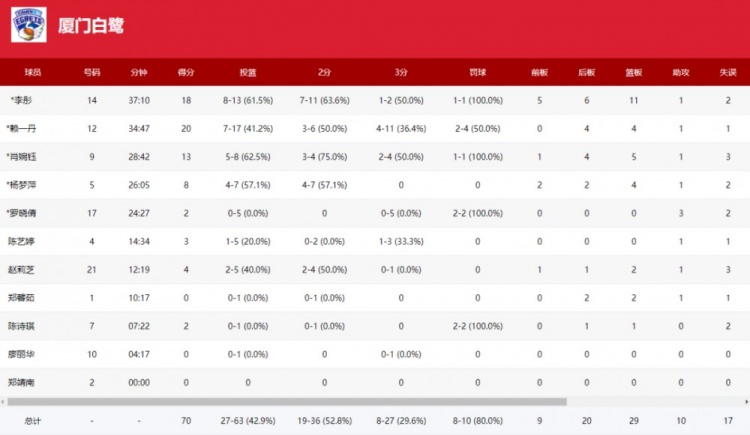 球員方面,全隊共有李彤、賴一丹、李彤和肖婉鈺三名球員得分上雙,楊夢萍也有8分入賬,其中肖婉鈺開場連中兩記三分球幫助球隊打開局面,李彤的反擊和沖擊力令人印象深刻,緊要關頭賴一丹也是不負眾望用自己的大心臟三分幫助球隊收下兩連勝。