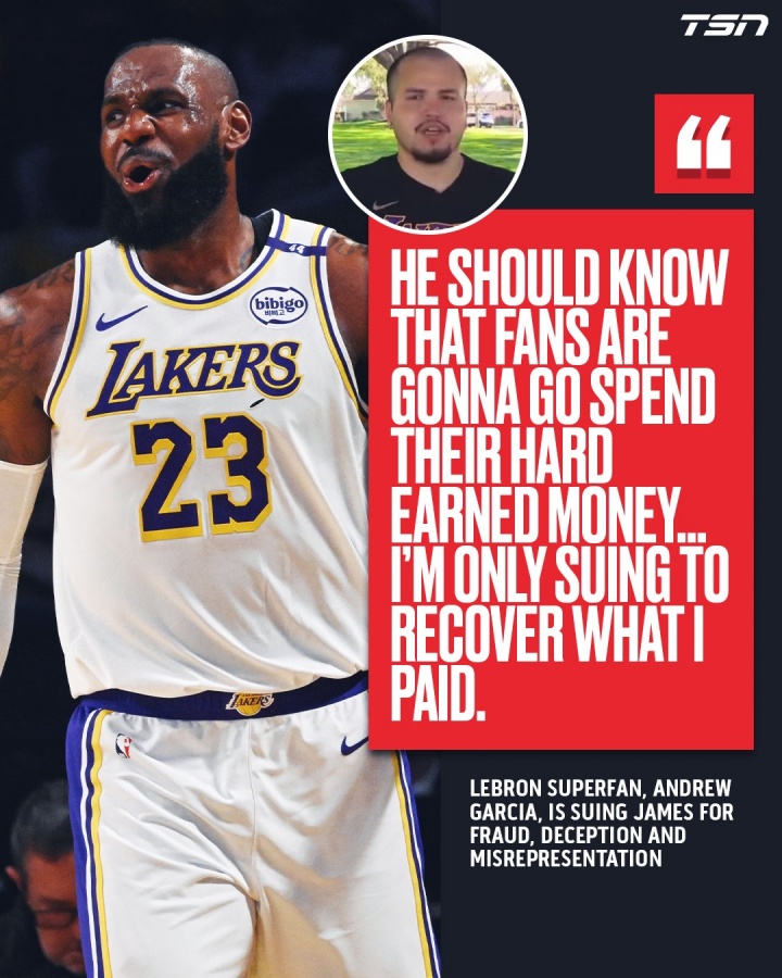 一名29歲的湖人終身球迷安德魯-加西亞于周三在洛杉磯縣的小額索賠法院提起訴訟,聲稱勒布朗-詹姆斯欠他865.66美元。據(jù)稱,詹姆斯曾暗示自己即將宣布退役。
