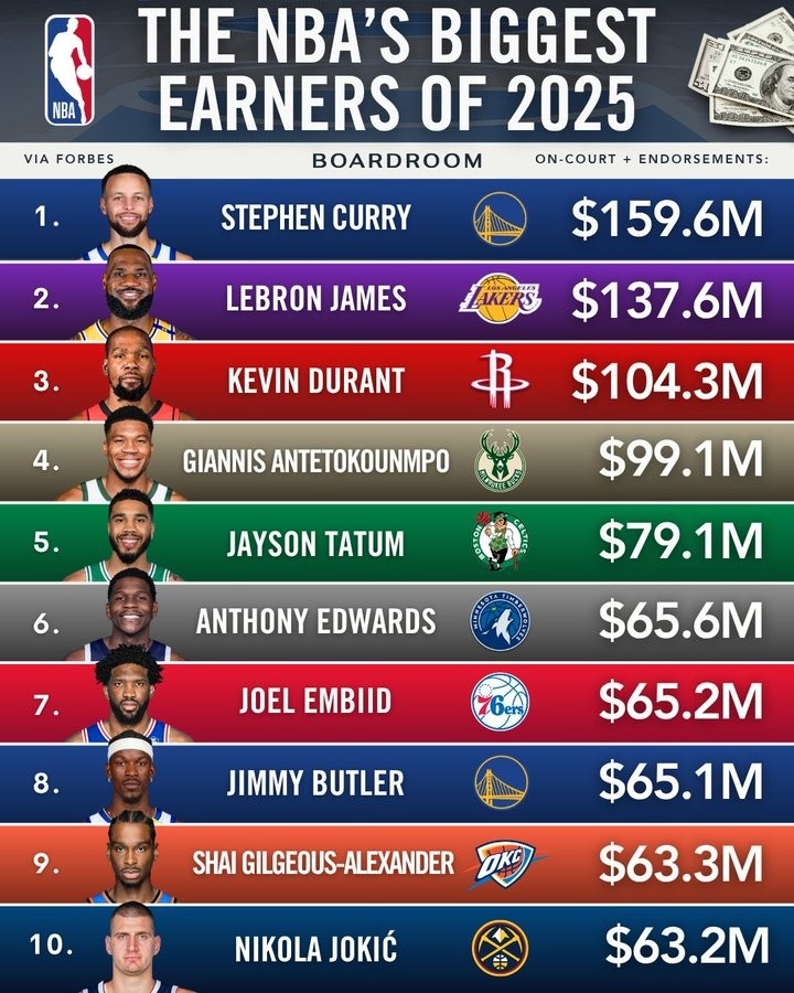 Boardroom列出本年度NBA球星收入排行(賽場收入+代言收入):,具體如下: