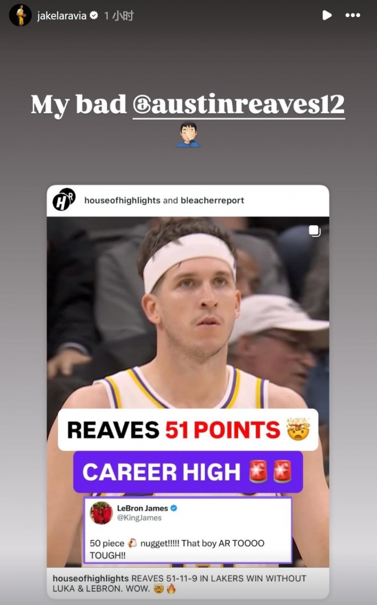 比賽最后時(shí)刻,拉拉維亞快攻被帽,使得里夫斯沒(méi)能夠獲得50分三雙;對(duì)此,他賽后在INS轉(zhuǎn)發(fā)了里夫斯的數(shù)據(jù),并寫道:“我的錯(cuò)@里夫斯