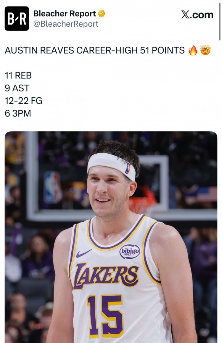 此役,里夫斯出戰(zhàn)39分鐘,22投12中,三分球10中6,22罰21中爆砍生涯新高的51分外加11板9助2斷,正負值高達+22。