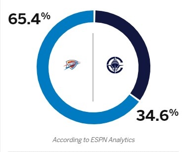 11月4日訊 快船今日119-120主場(chǎng)不敵熱火,明天將背靠背對(duì)陣?yán)做?/p>ESPN預(yù)測(cè)本場(chǎng)勝率,雷霆65.4%,快船34.6%。雷霆目前7勝0負(fù),為聯(lián)盟唯一不敗的球隊(duì)。