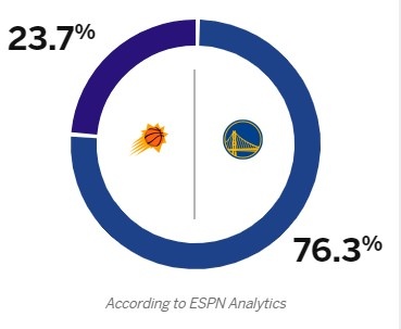 ESPN預(yù)測(cè)本場(chǎng)勝率,主場(chǎng)作戰(zhàn)的勇士被大幅看好,勝率76.3%,太陽(yáng)只有23.7%。