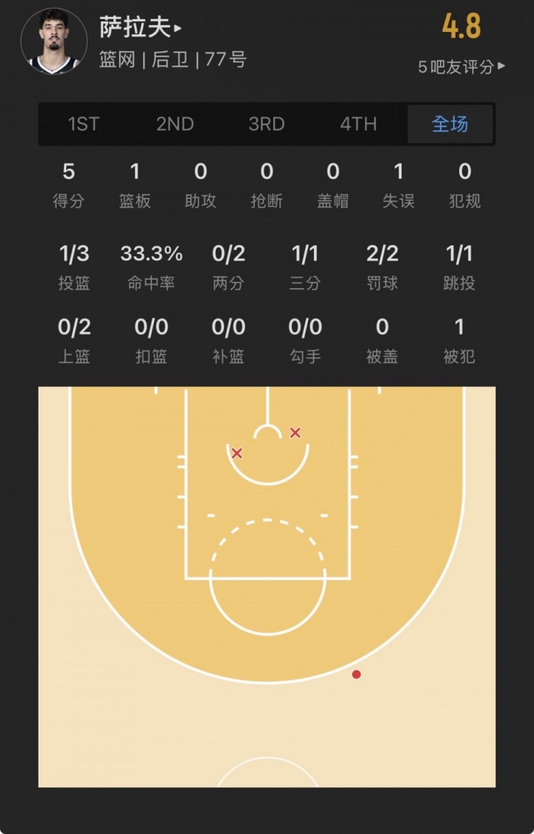 籃網(wǎng)26號秀 本-薩拉夫 登場3.6分鐘