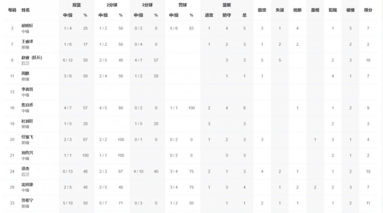 廣東全運(yùn)男籃此役除了李炎哲沒(méi)有上場(chǎng)外,11人出場(chǎng)均有得分,趙睿16分3籃板5助攻,徐杰19分3籃板4助攻1搶斷,胡明軒7分5籃板3助攻4搶斷,賀希寧11分1籃板2助攻。