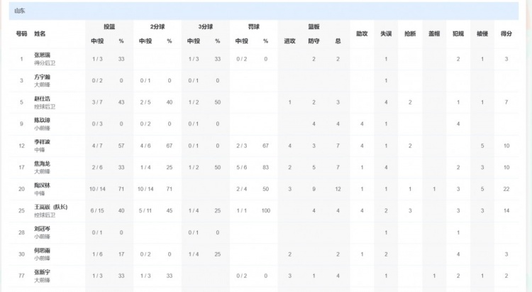 山東隊(duì)方面,陶漢林22分12籃板1助攻1搶斷1蓋帽,王嵐嵚14分4籃板4助攻3搶斷,李祥波10分7籃板4助攻2搶斷,焦海龍10分7籃板1助攻。