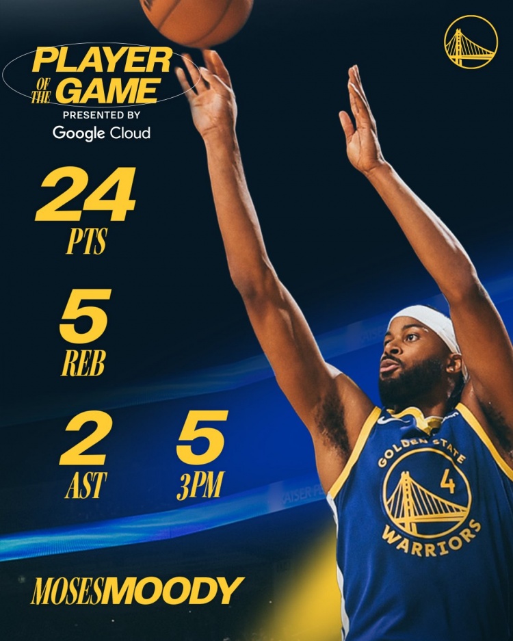 賽后勇士官方評選出了本場比賽最佳球員,給到了穆迪。