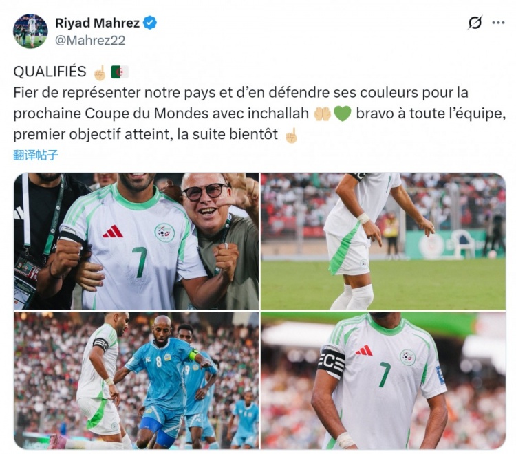 10月10日訊 世預(yù)賽非洲區(qū)比賽,馬赫雷斯傳射建功,幫助阿爾及利亞3-0擊敗索馬里,獲得世界杯參賽資格。馬赫雷斯社媒曬出比賽照片,并寫道:“晉級(jí)世界杯!很榮幸能代表祖國(guó)出戰(zhàn),捍衛(wèi)我們的榮耀,晉級(jí)下屆世界杯!愿真主保佑