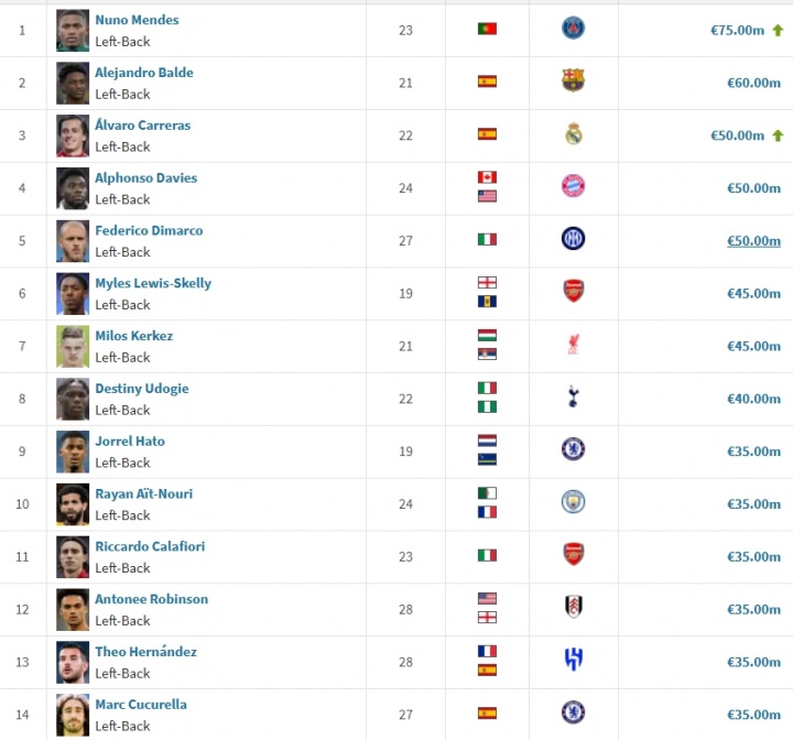左后衛(wèi)身價榜↓