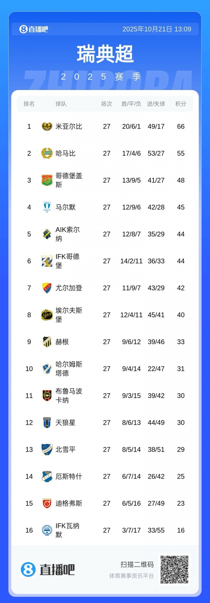 2025年,在連續(xù)五個(gè)賽季排在瑞典頂級(jí)聯(lián)賽前十之后,本賽季米亞爾比奪冠!下賽季將參加歐冠附加賽