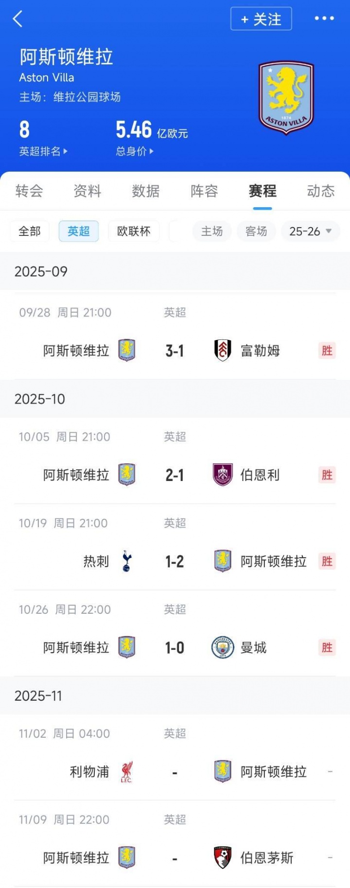 10月27日訊 英超第9輪,阿斯頓維拉1-0力克曼城,豪取聯(lián)賽4連勝。