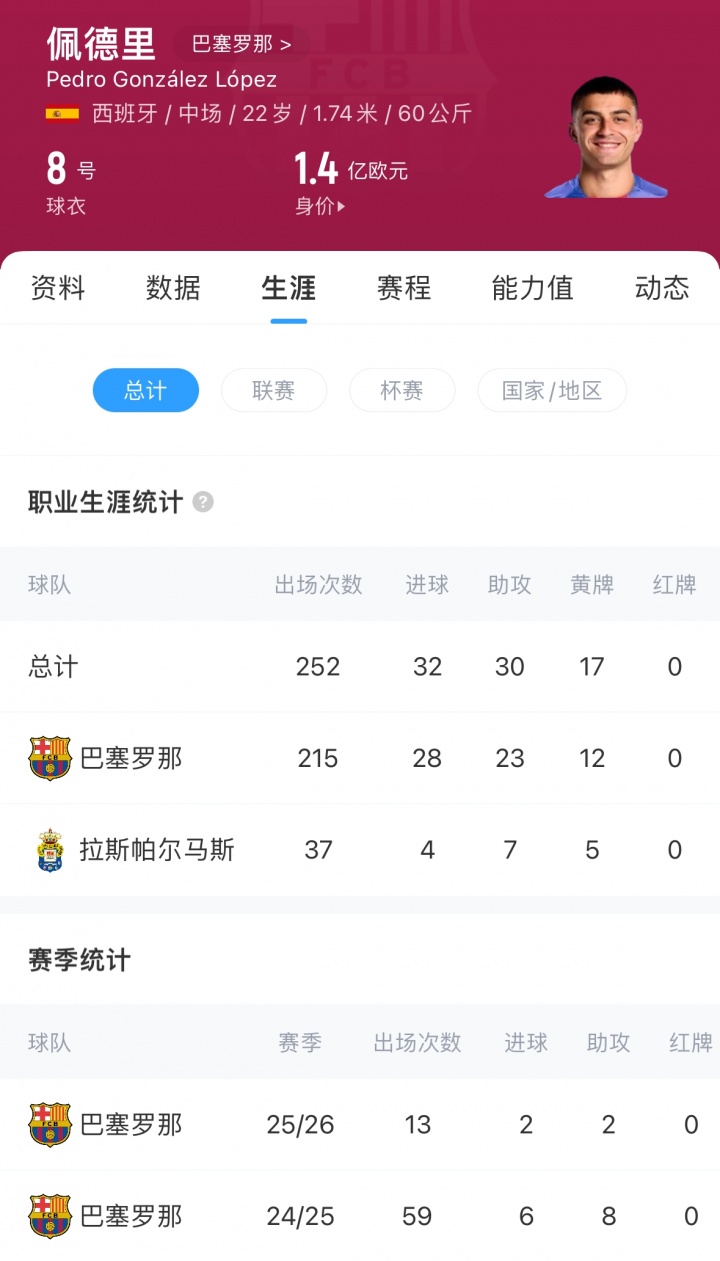 佩德里本賽季已為巴薩出戰(zhàn)13場比賽,總出場時間1099分鐘,而上個賽季佩德里為巴薩的出場次數達到了可怕的59場,總計4646分鐘。